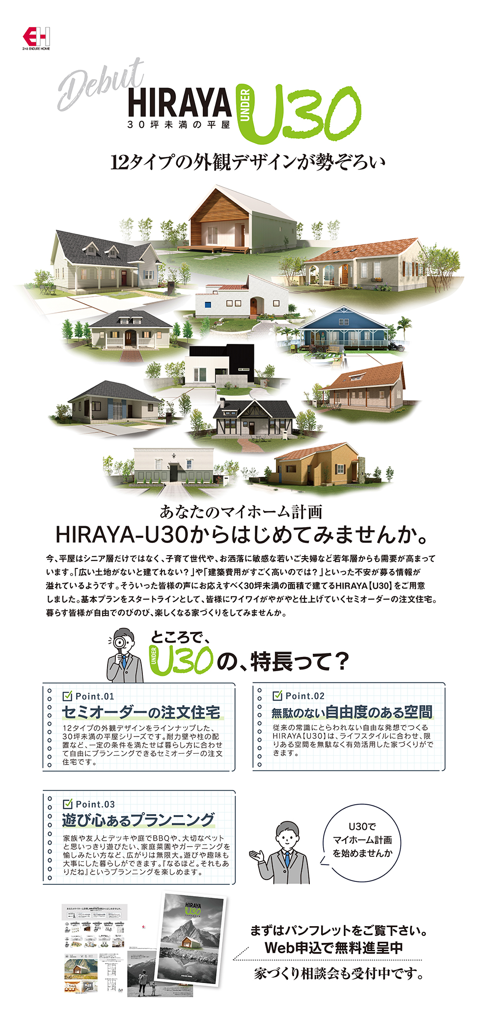 インデュアホーム秋田は、秋田市で新築の家づくりをしています。 今回、従来の常識にとらわれない自由な発想でつくる30坪未満の面積で建てるHIRAYA【U30】のパンフレットを無料で差し上げます。