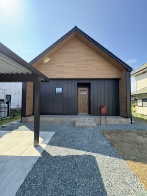 外壁はガルバリウムのブラック系に合わせて破風や雨樋、サッシもブラックで統一しました。