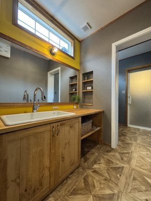 そのまま洗面スペース、脱衣ランドリー、お風呂という一直線の水回り動線は子育てママに優しいプラン。