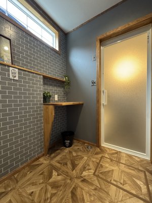 グレーのクロスを基調にウォルナット色の巾木・ケーシング・回り縁が良い感じにヴィンテージ感を演出。キッチン廻りはブリックタイル調のクロスやキッチン天板もヘアラインのステンレス仕上げでインダストリアルなテイストに。