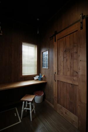 ユーティリティーのバーンドアという上吊りレール式引き戸もかっこいいです!