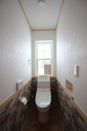 リビングは小上がりを入れるとなんと26畳!子供が走り回れます。壁や天井にはパインの羽目板を貼ったり、一部ブリックタイルを貼ったり、天井には化粧梁を付けて空間にアクセントを付けました。基本的には白をベースにティファニーブルーのクロスや黒の照明器具でピリッとしたインテリアに。