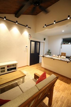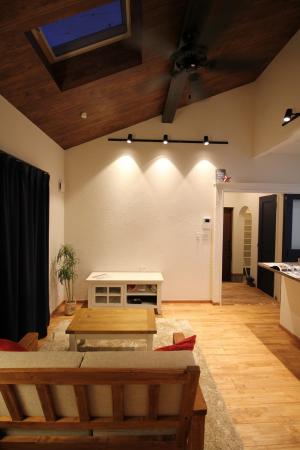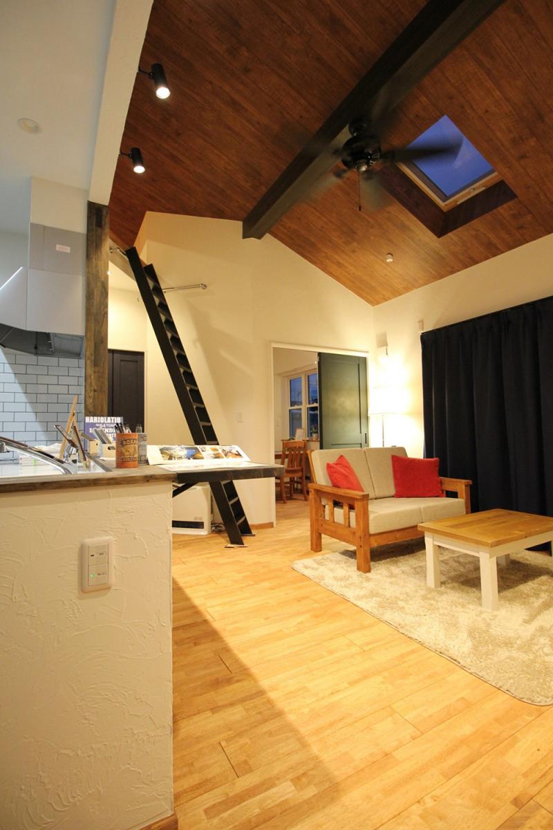 平屋といえど狭く感じさせないようにリビングは勾配天井の吹き抜けに。天窓も入れたのでとっても明るいです!
