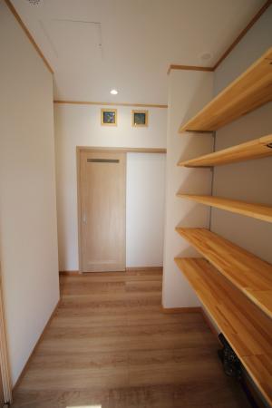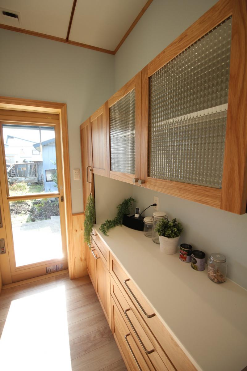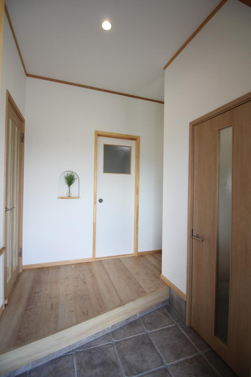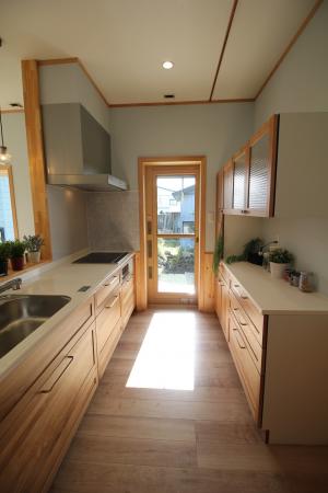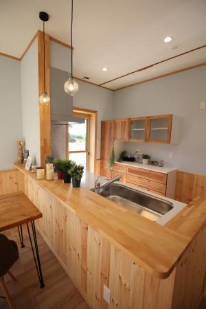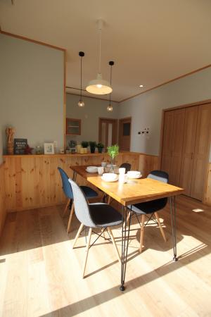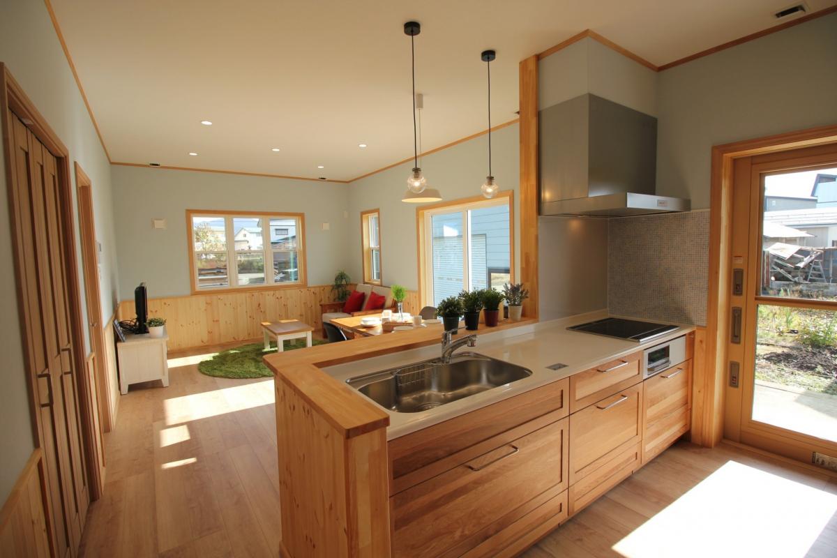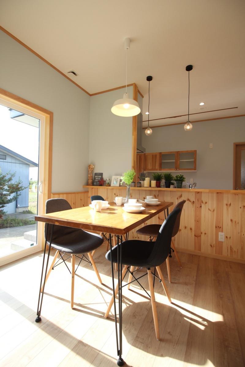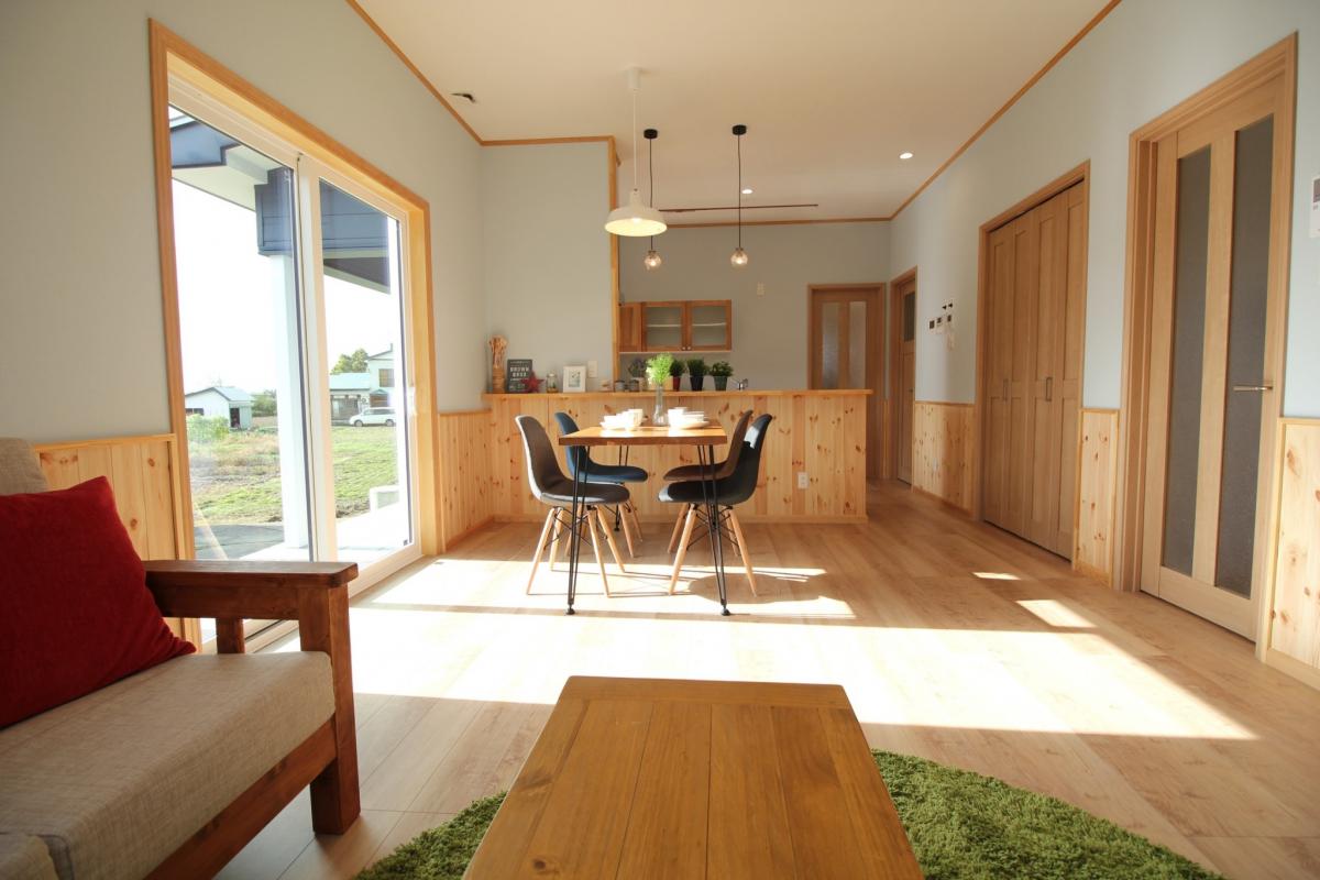 T様邸は外観こそシンプルモダンですが、内装は明るい木目を基調としたナチュラルテイスト。リビング腰壁のパイン羽目板が温かみを感じさせます。