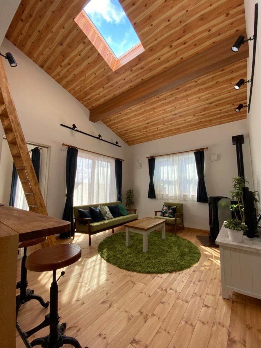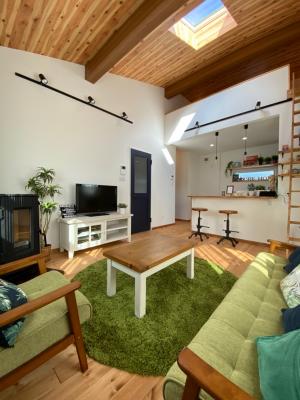 リビングは屋根勾配を活かした勾配天井で天井高が高く、とっても開放的!