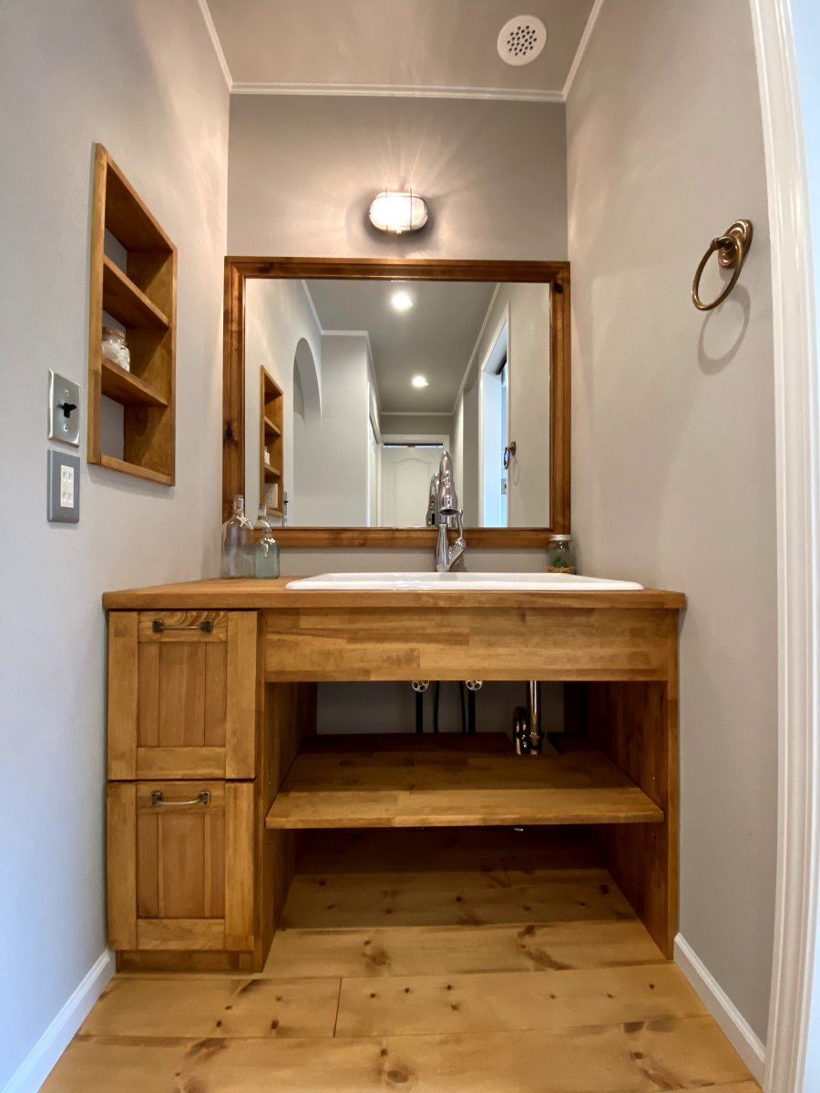 洗面所としてではなくホールに洗面台を設置することで帰宅してすぐ手を洗ったり、朝二階から下りてきてすぐ顔を洗ったり実用的。