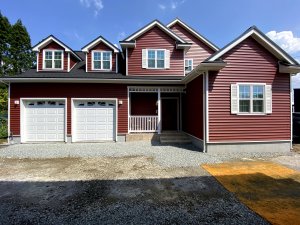 急勾配の切り妻屋根とガレージのドーマー、玄関カバードポーチと、アーリーアメリカンスタイルの王道的デザインを人気の外壁色レッドウッドで印象的にまとめたK様邸。
