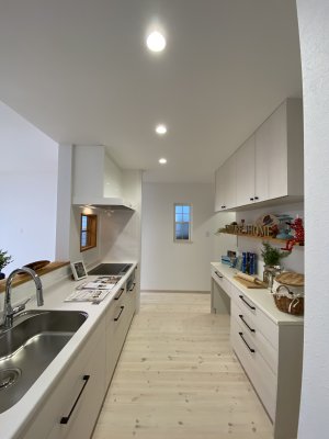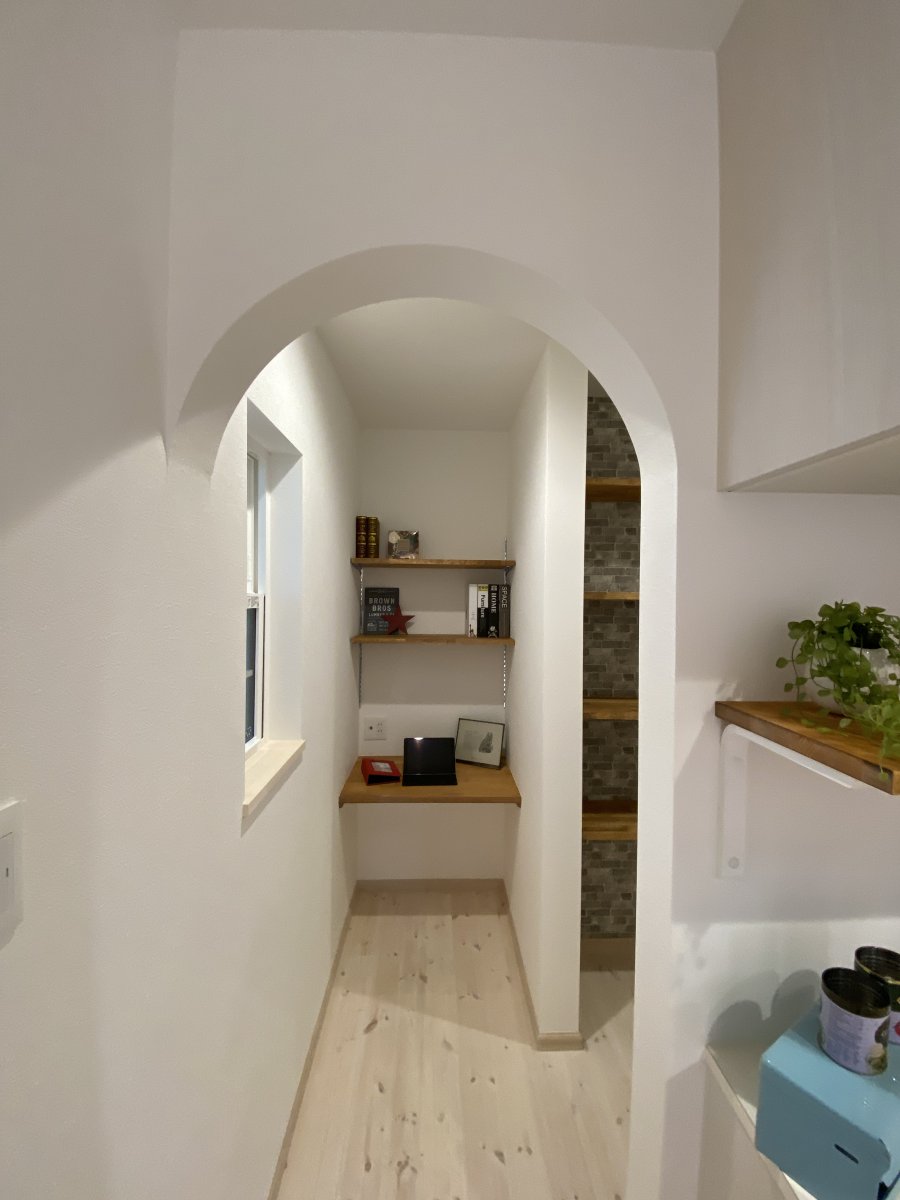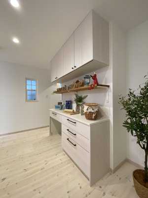 奥様こだわりのアイランド型のキッチンと大容量のパントリー、リビングに家族分のロッカースペース、洗面室隣には5畳のランドリースペースも!とにかく収納がたくさんで色んなものをしまえます。
