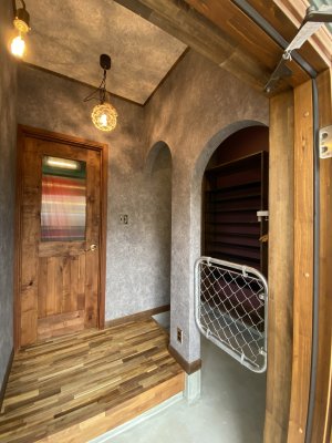 中に入ると無骨なPCフェンスのゲートのシューズクロークが。