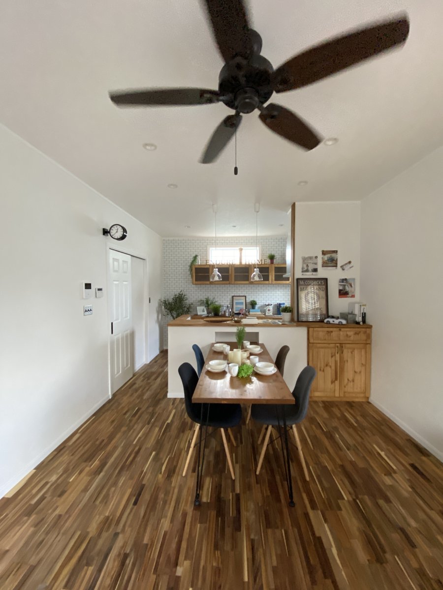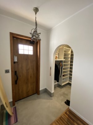 床面積33坪ながら家の真ん中に3畳のファミリークロークを配置し、パントリー、ランドリールーム、洗面脱衣室への動線の良さと、リビングからも玄関ホール側からもアクセスできる回遊動線がまさに「神」がかっている動線のサーファーズハウスです。