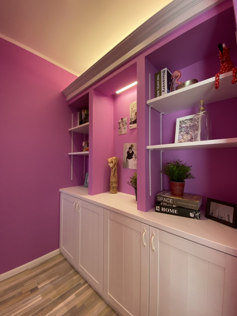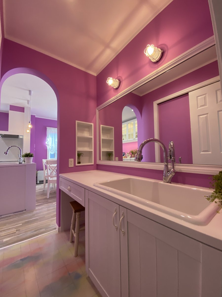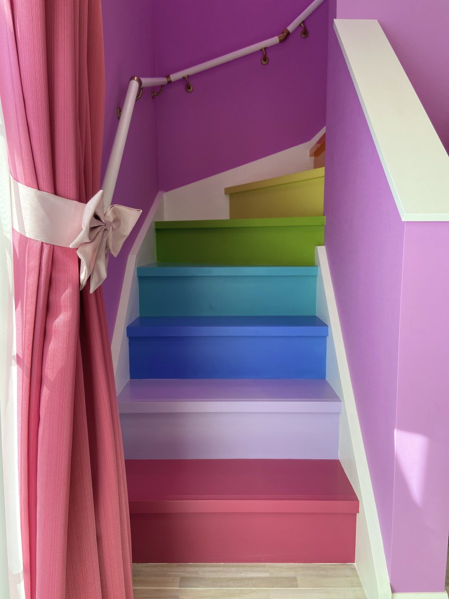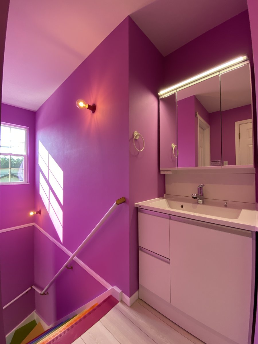 奥様が好きなピンクやパープル、ターコイズブルーなど強めのカラーをたくさん使いながらも、