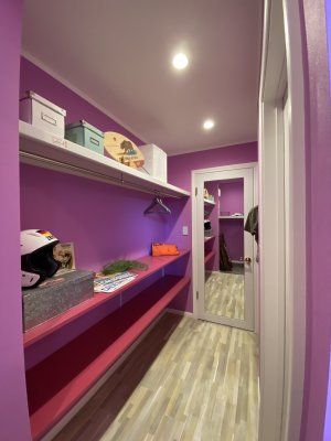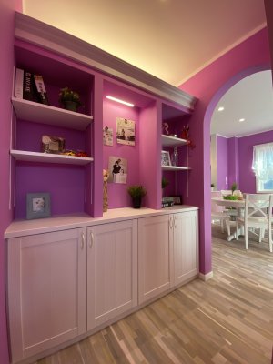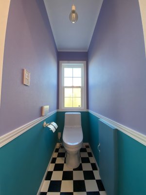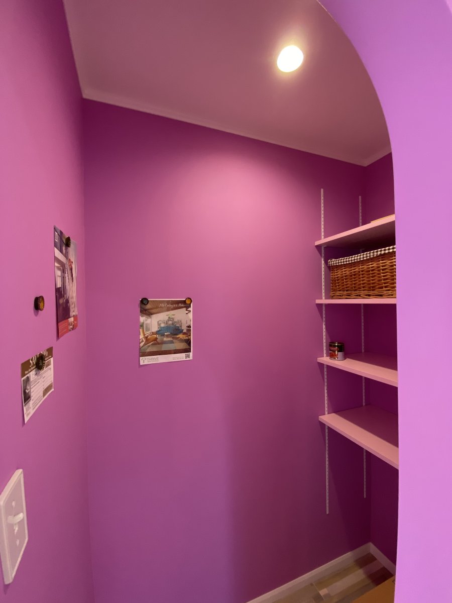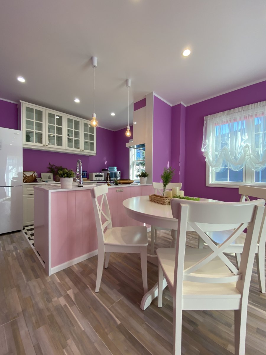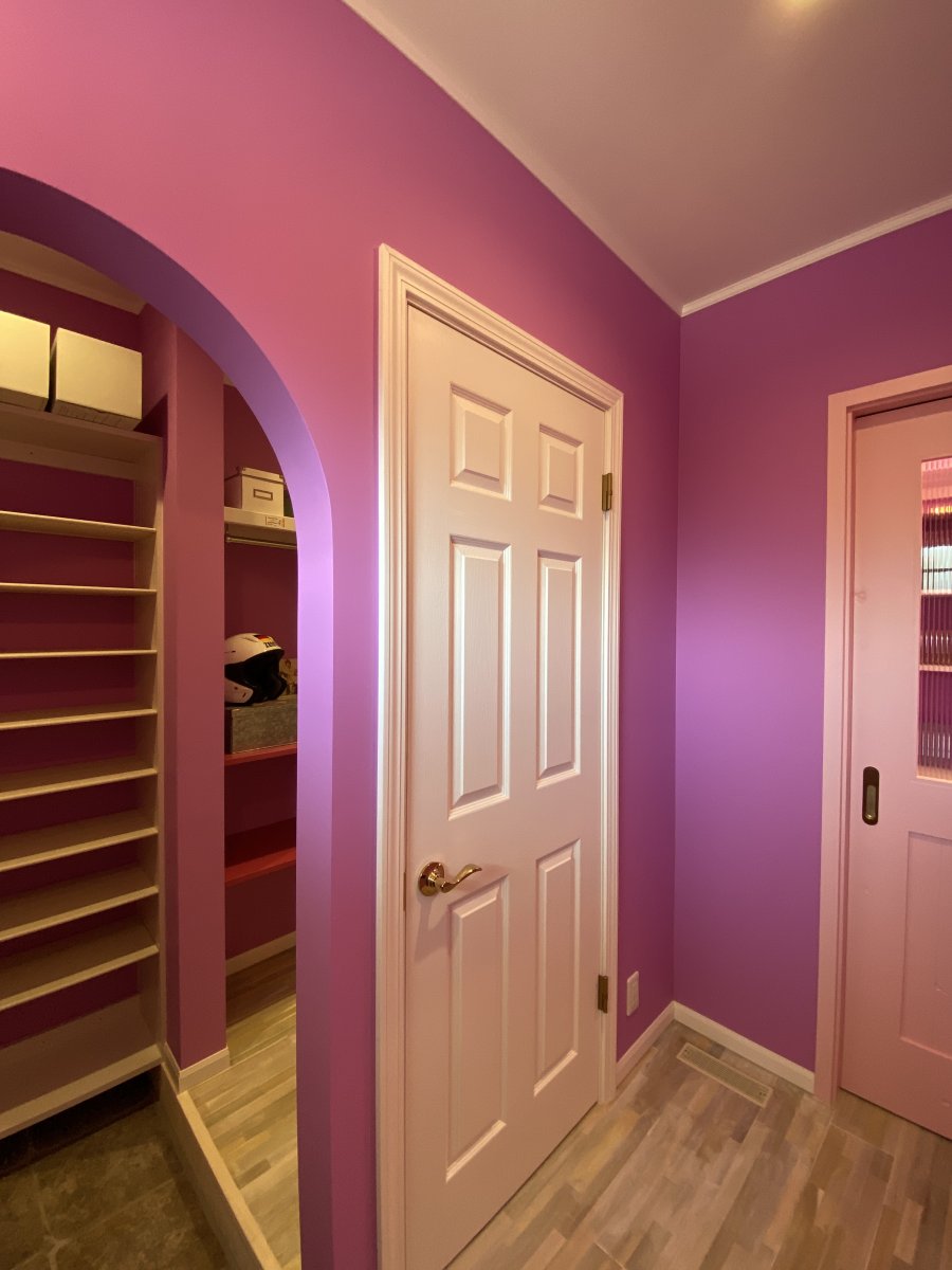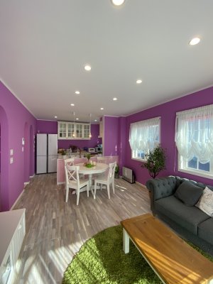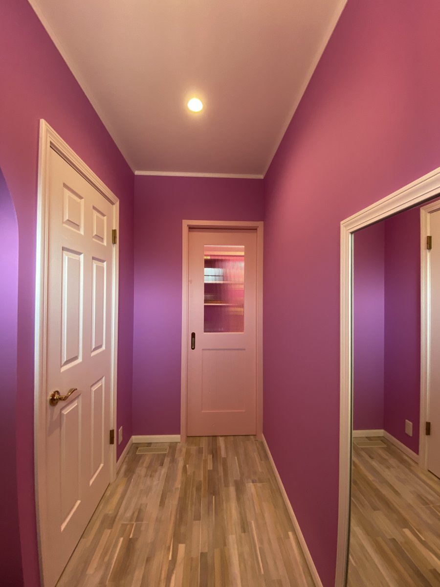 でも玄関ドアを開けると・・・ヴィヴィッドなパープルのクロスがお出迎え。