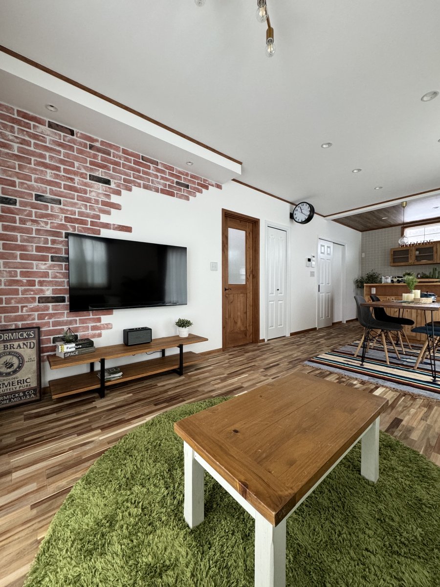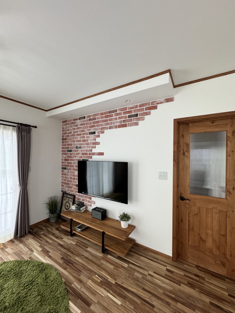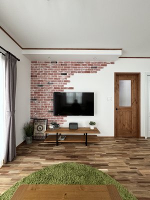 無垢のフローリングに赤みのあるブリックタイルがアクセントで良く映えます。
