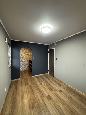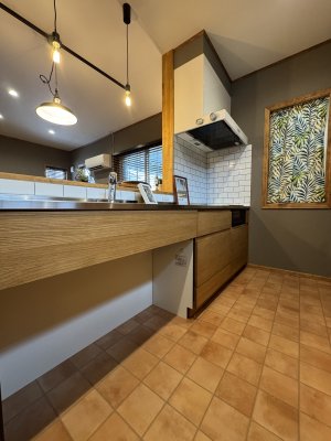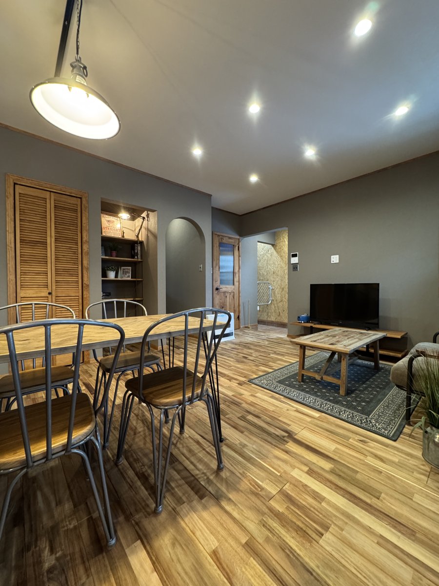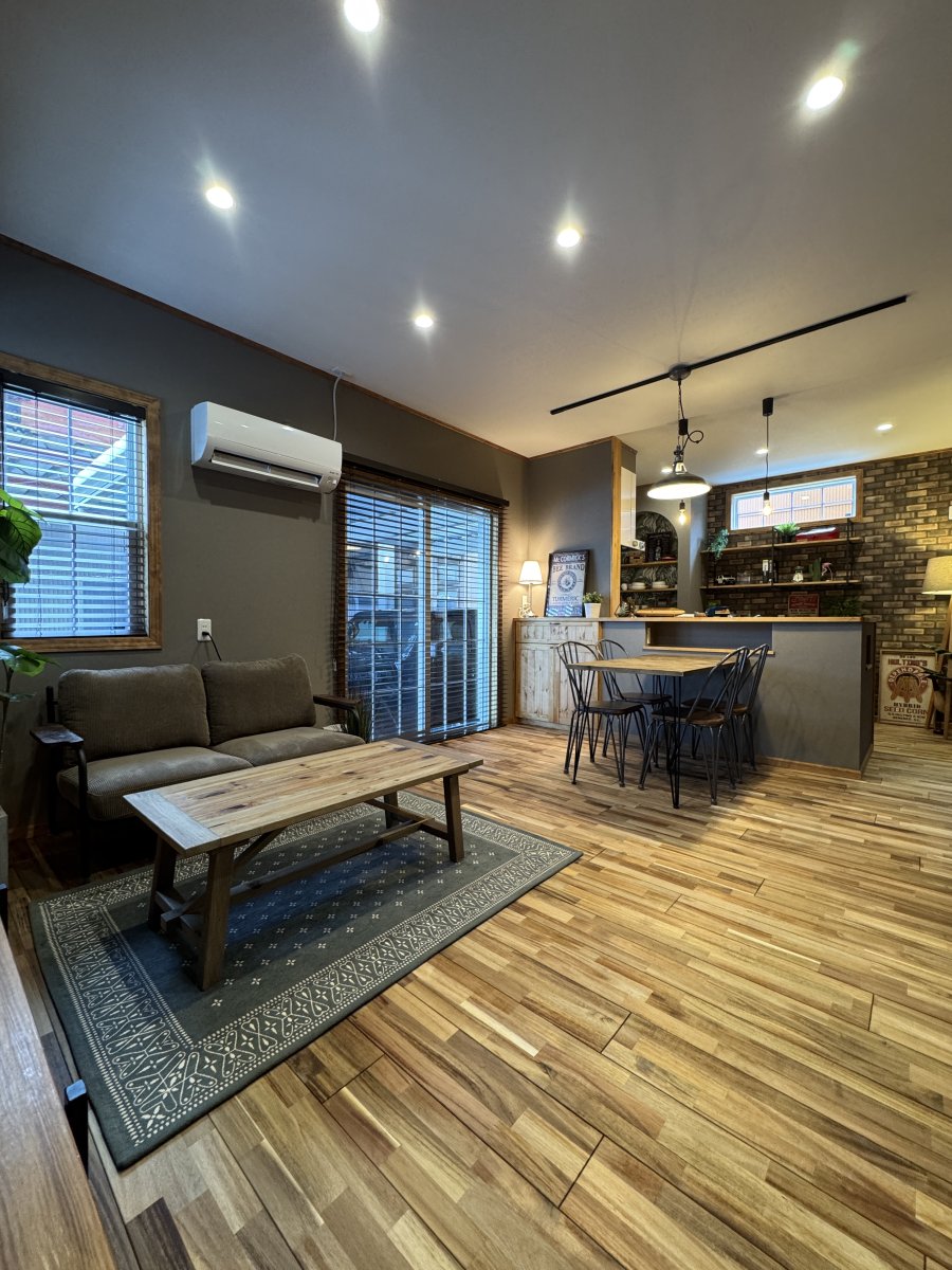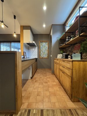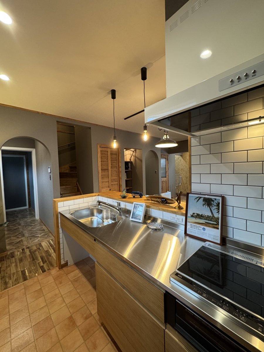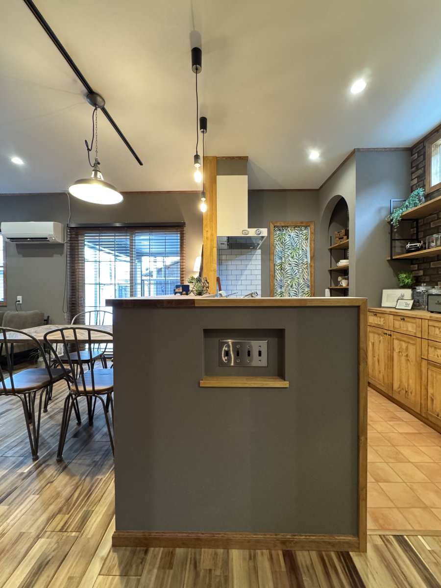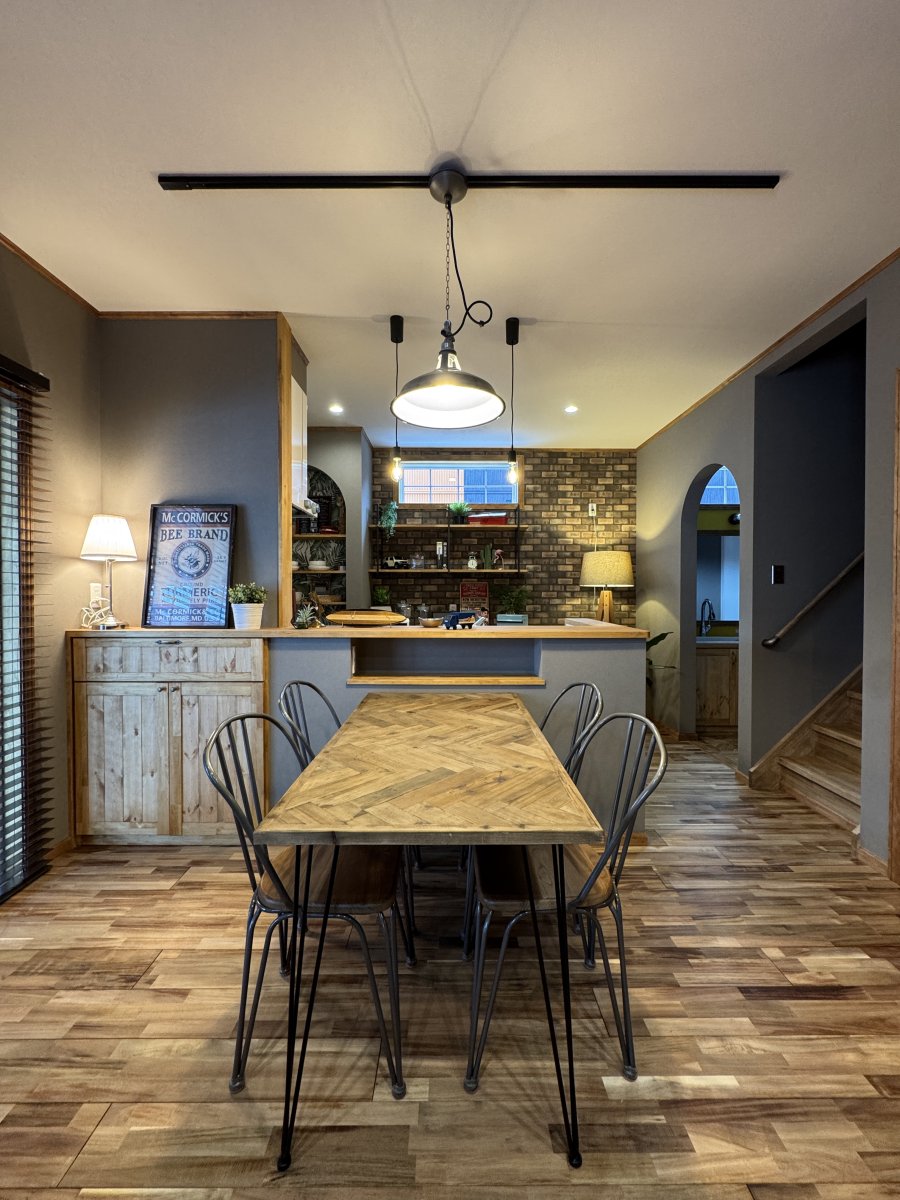 グレーのクロスを基調にウォルナット色の巾木・ケーシング・回り縁が良い感じにヴィンテージ感を演出。キッチン廻りはブリックタイル調のクロスやキッチン天板もヘアラインのステンレス仕上げでインダストリアルなテイストに。