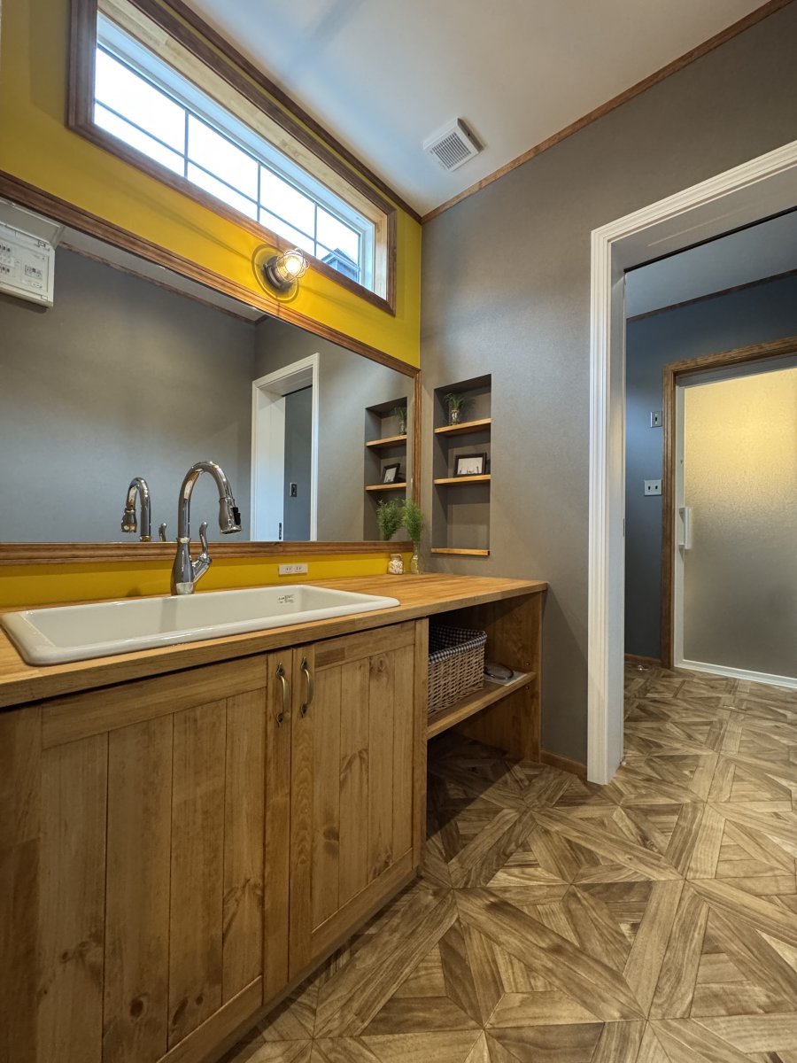 そのまま洗面スペース、脱衣ランドリー、お風呂という一直線の水回り動線は子育てママに優しいプラン。