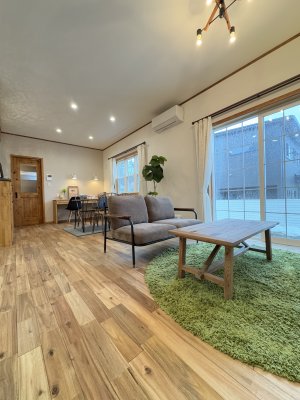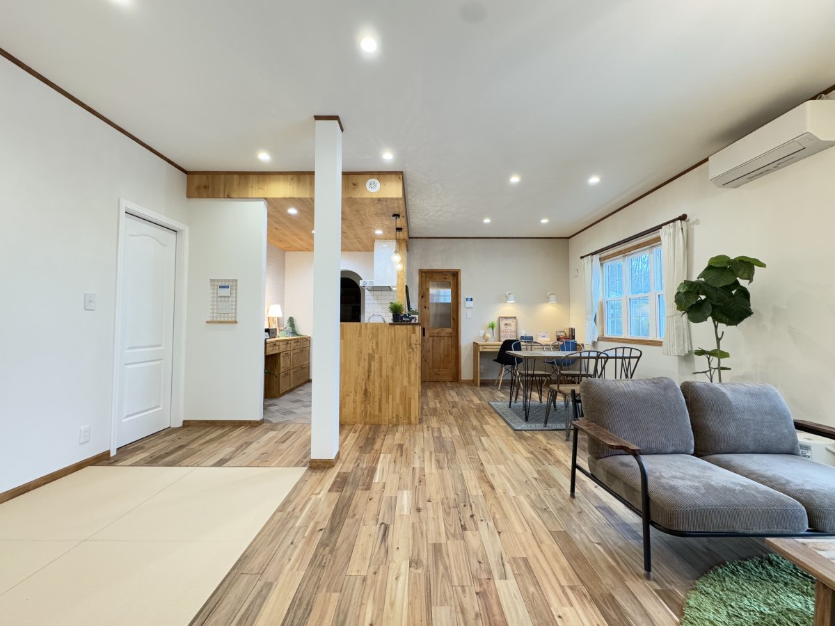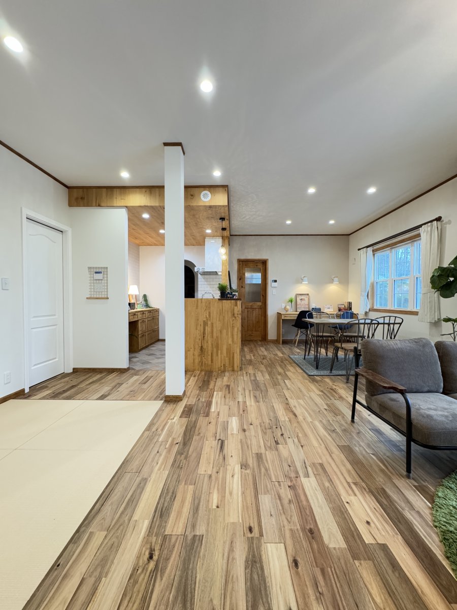 広々としたウッディなLDKは単体でも20畳弱あり、それでも十分広いですが隣接した3畳分の畳スペースがさらにスペースの余裕を持たせます。