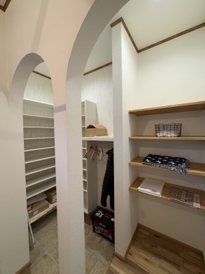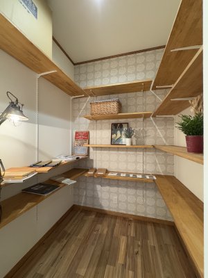 3.5畳のファミクロ、2畳のパントリーは収納力も抜群ですが、そのほかLDKには造作のキッチン向かいの収納、引き出し付きカウンター、階段下収納と各所に収納を確保。