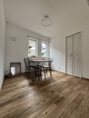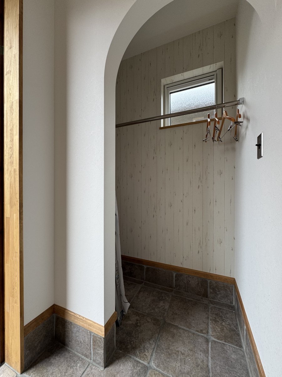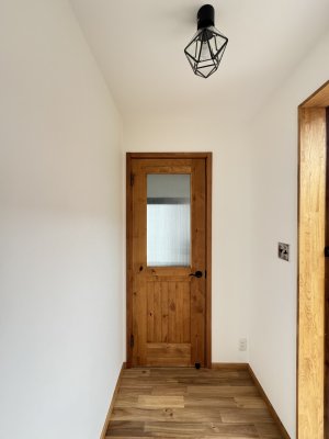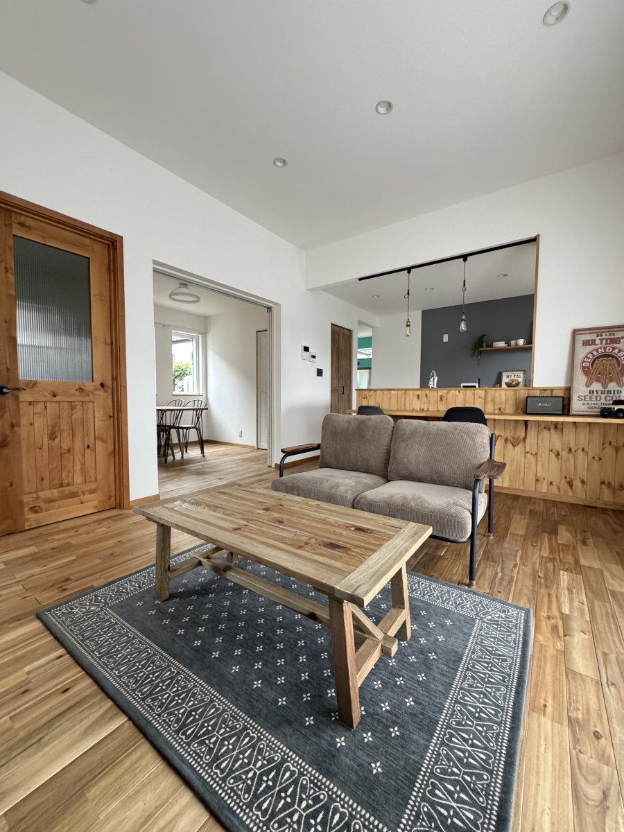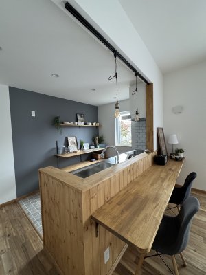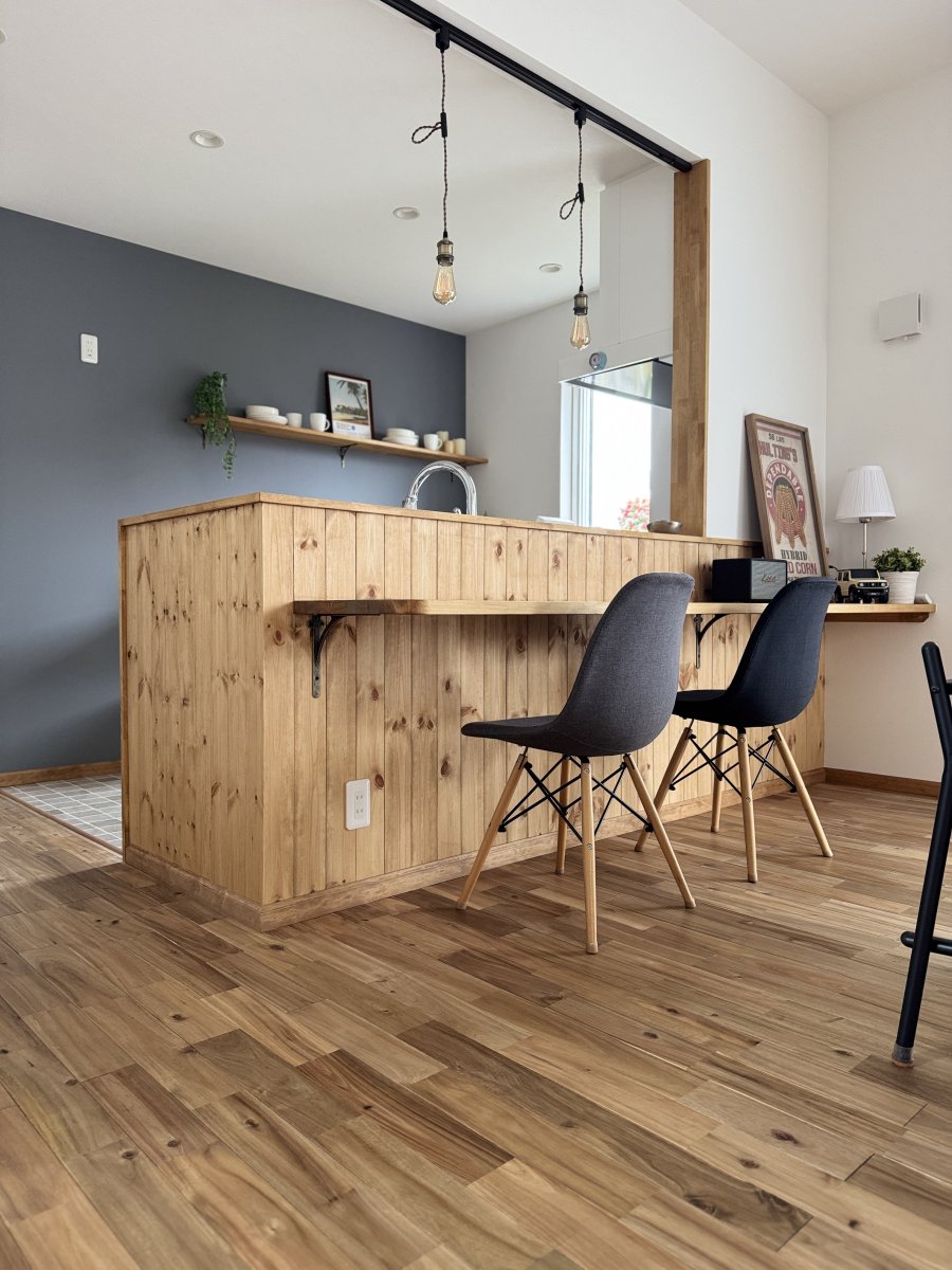 一部アクセントクロスを入れたり、キッチンカウンターは無垢パインの羽目板を採用して施主様のこだわりが垣間見えます。