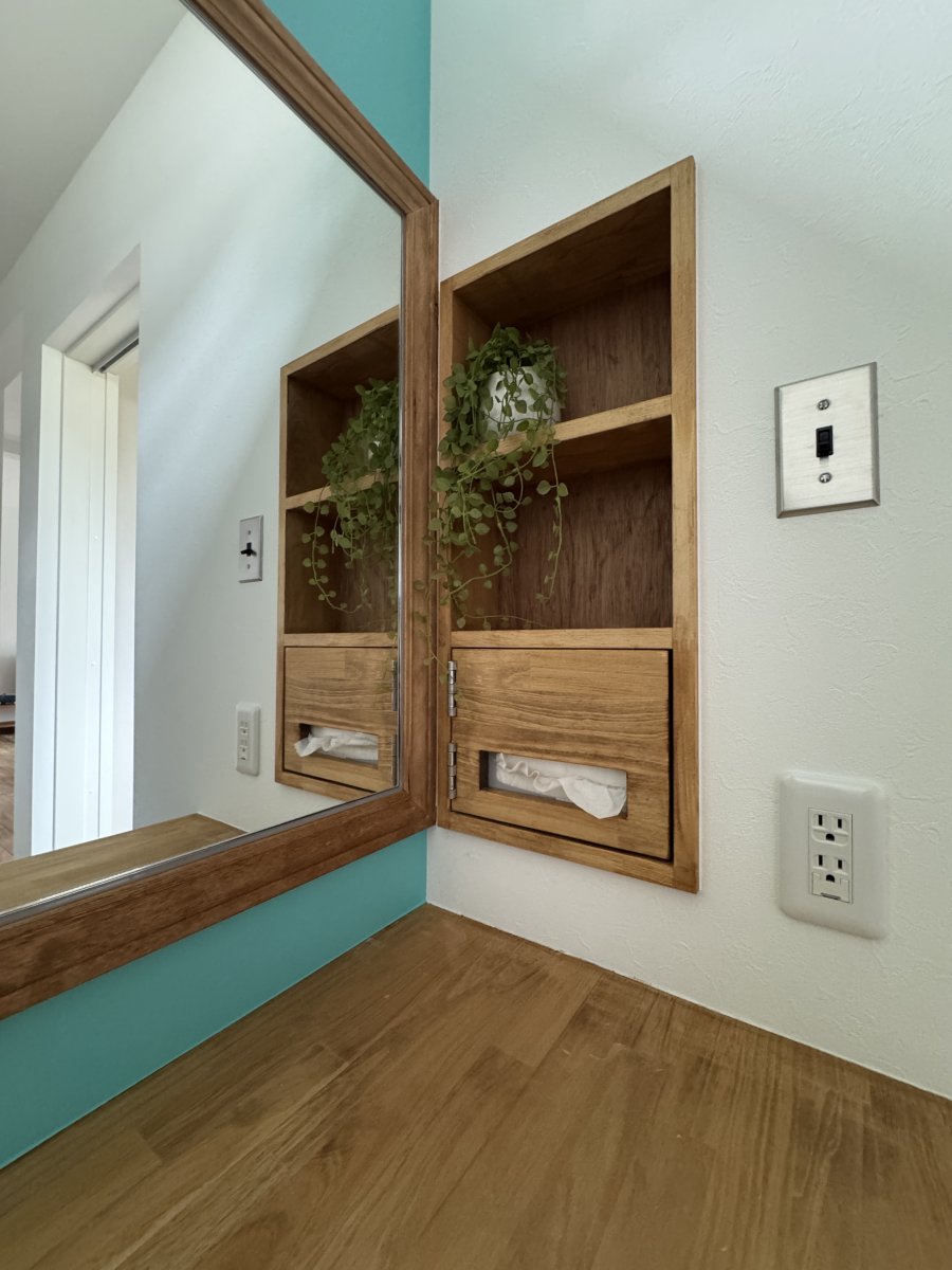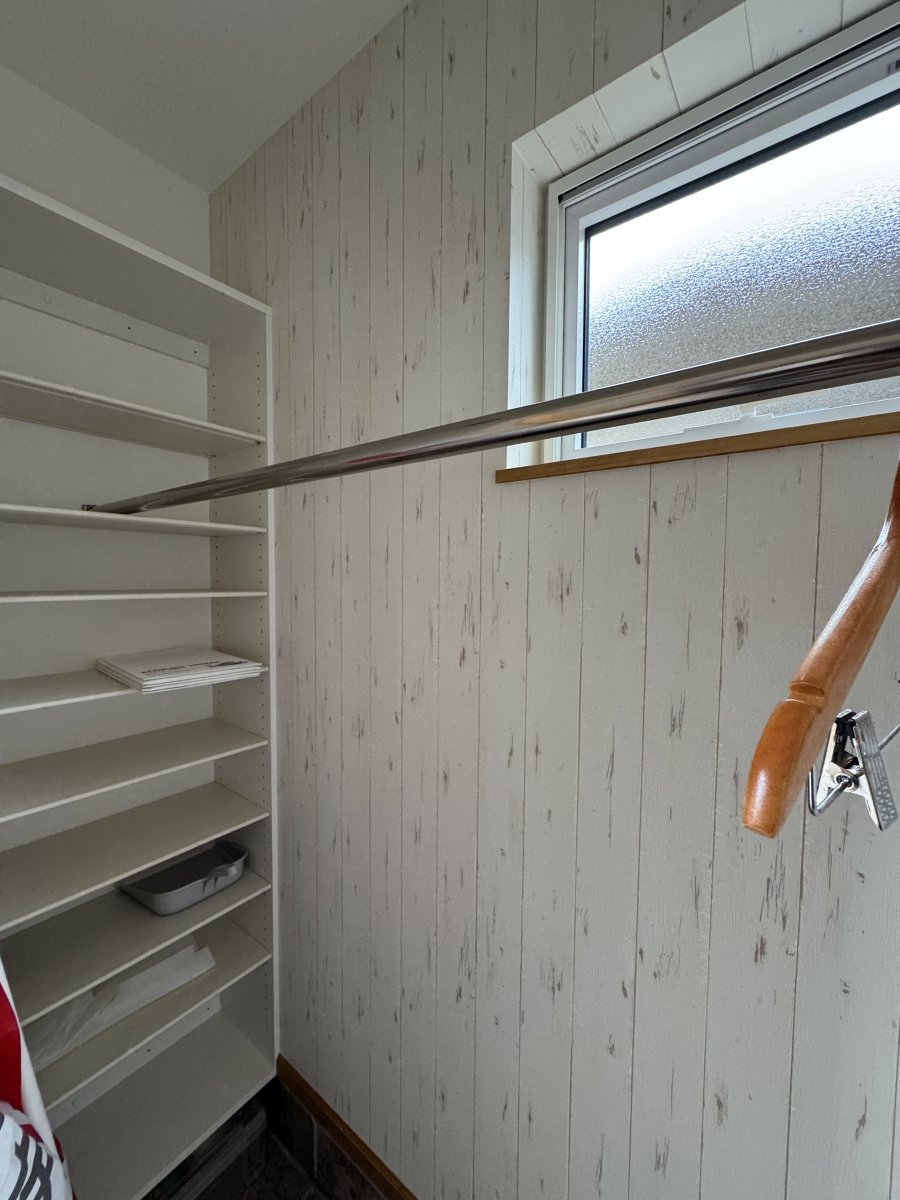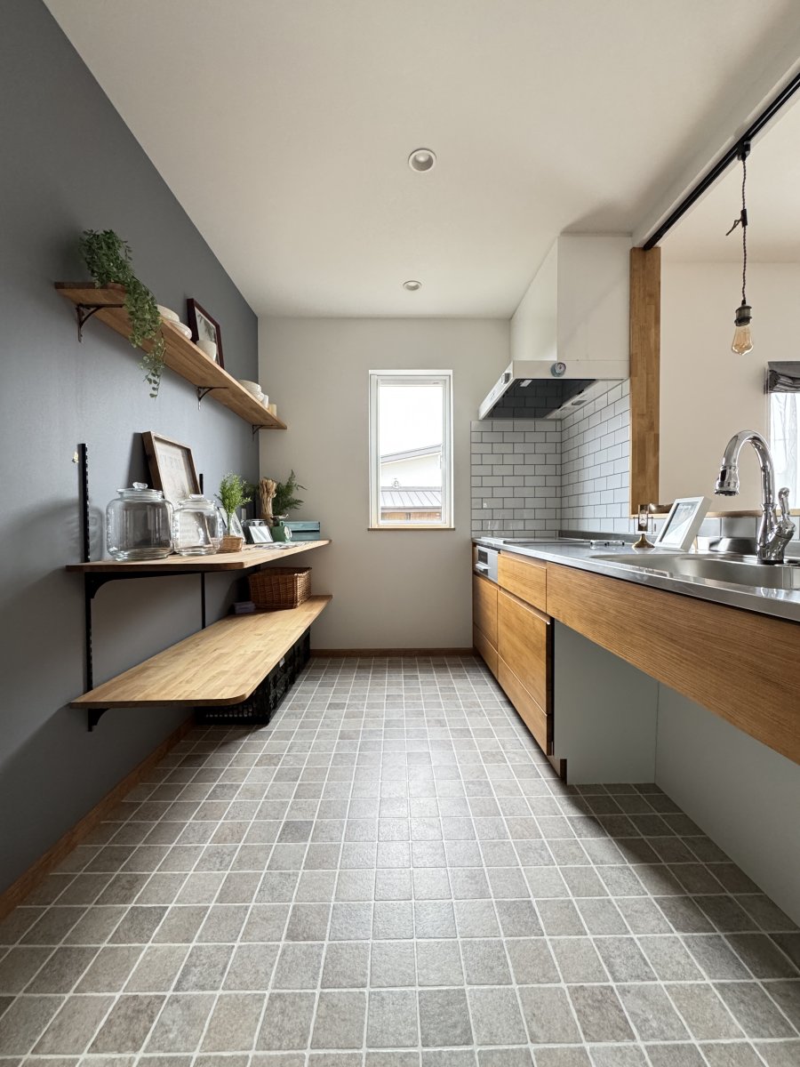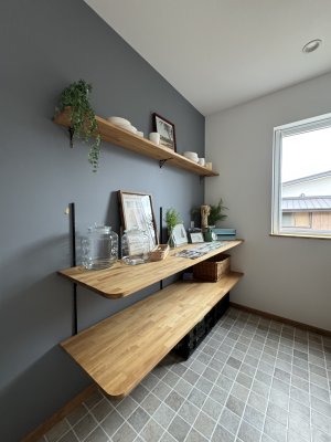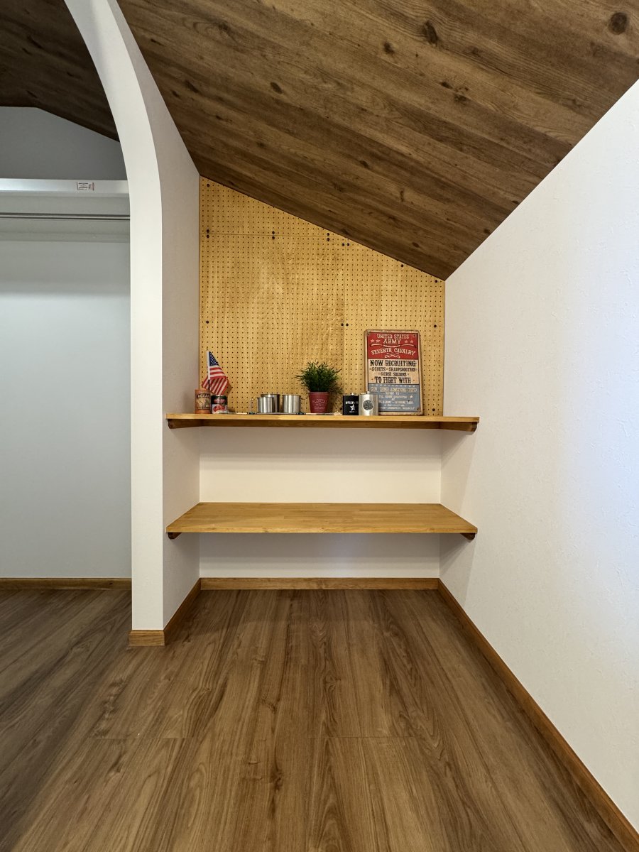 背面はいつものカップボード造作ではなく、シンプルに棚板のみというスタイル。