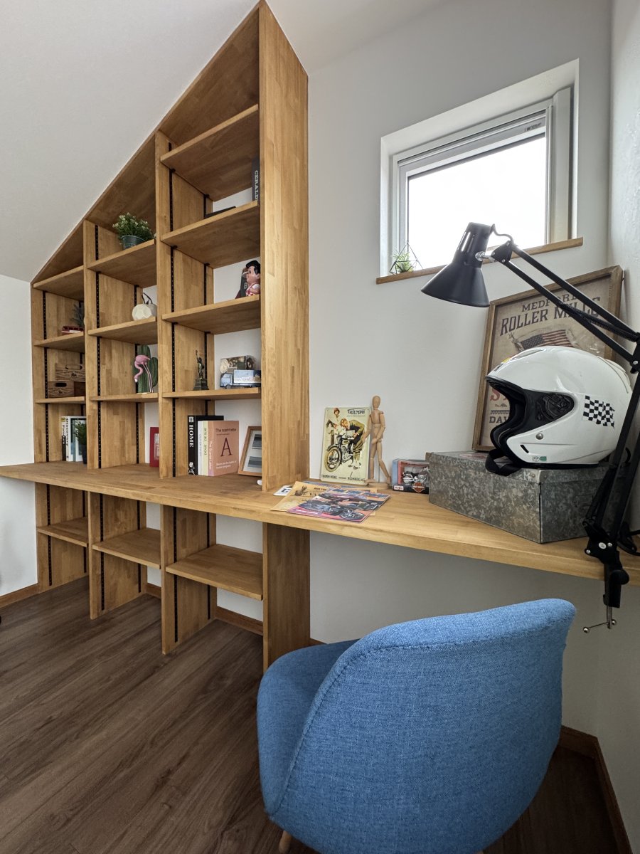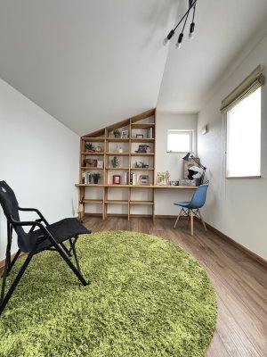 そして2階の寝室は造作のカウンター+本棚造作が目をひく空間に。