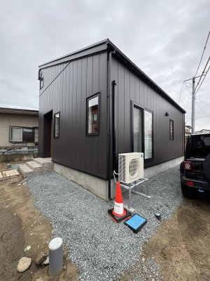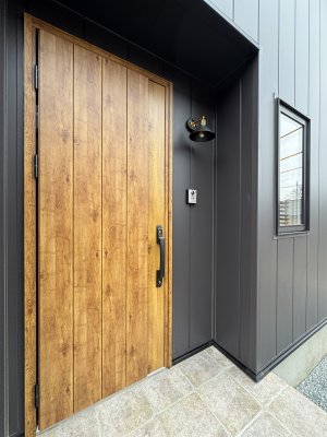 外壁はガルバリウムのブラック系に合わせて破風や雨樋、サッシもブラックで統一しました。
