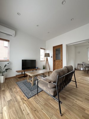 中に入ると一転、無垢アカシアと白い壁のナチュラルなインテリア。